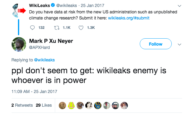 This act was a strong indication that far from sucking up to the Trump administration, WikiLeaks was already agitating it. It also lays waste to those who ten years earlier had been trying to posture WikiLeaks as being in the climate change-denier camp, publishing documents with an agenda to bolster that narrative.